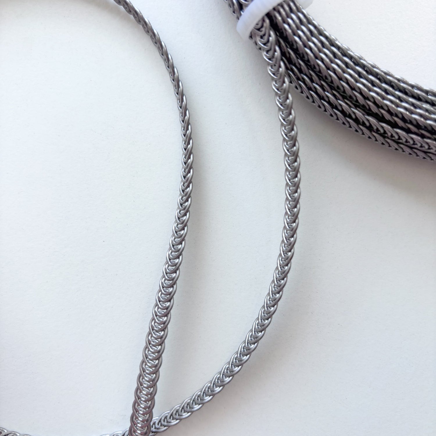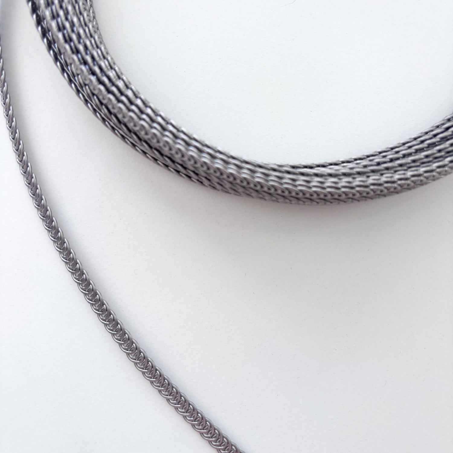 Steel spiral boning is made from a steel coil which has been flattened, which allows it to flex in all directions while still being very strong. This means that steel spiral boning is quite comfortable to wear, especially when used over curvier areas of the body like busts and hips, while still providing strength, structure, and smoothness.