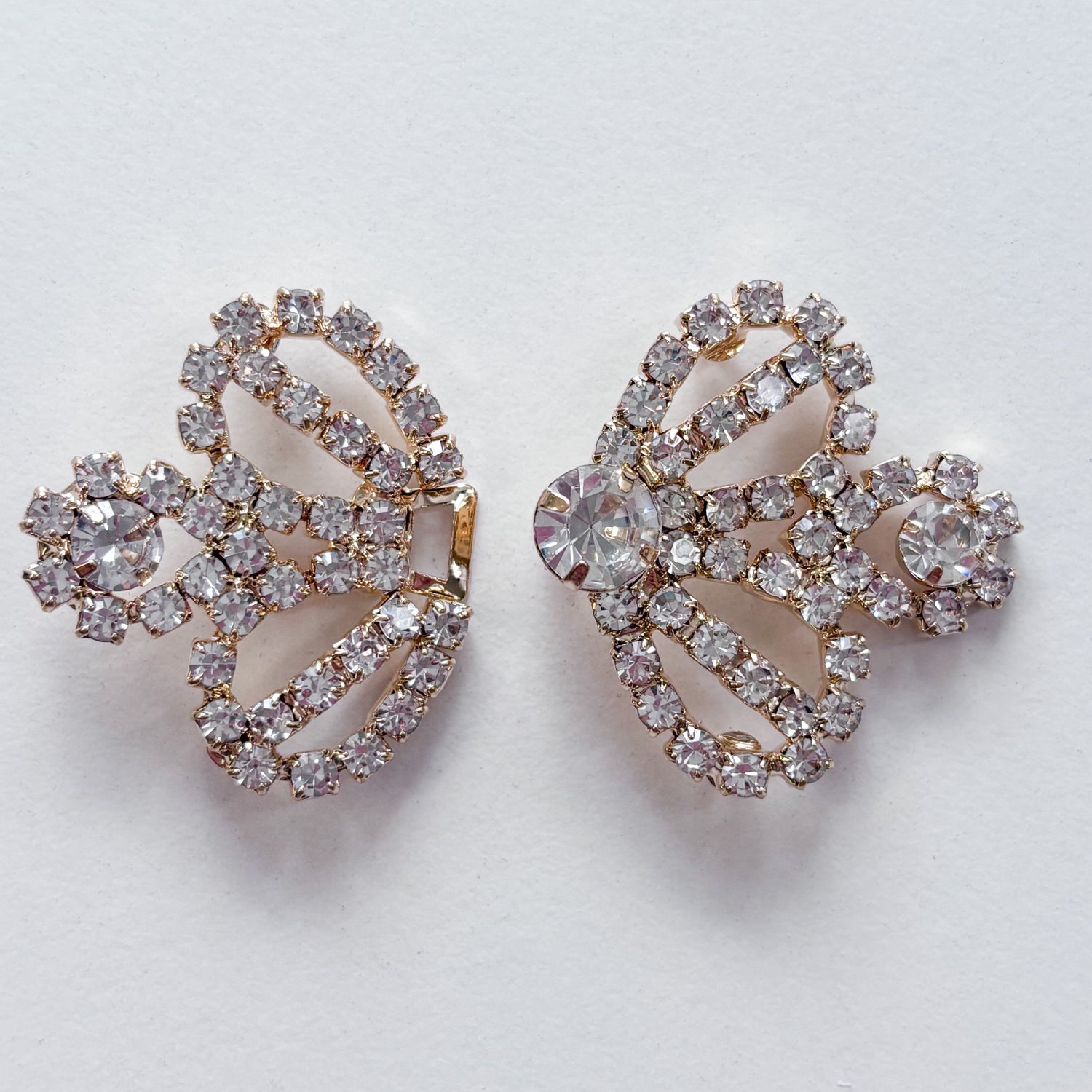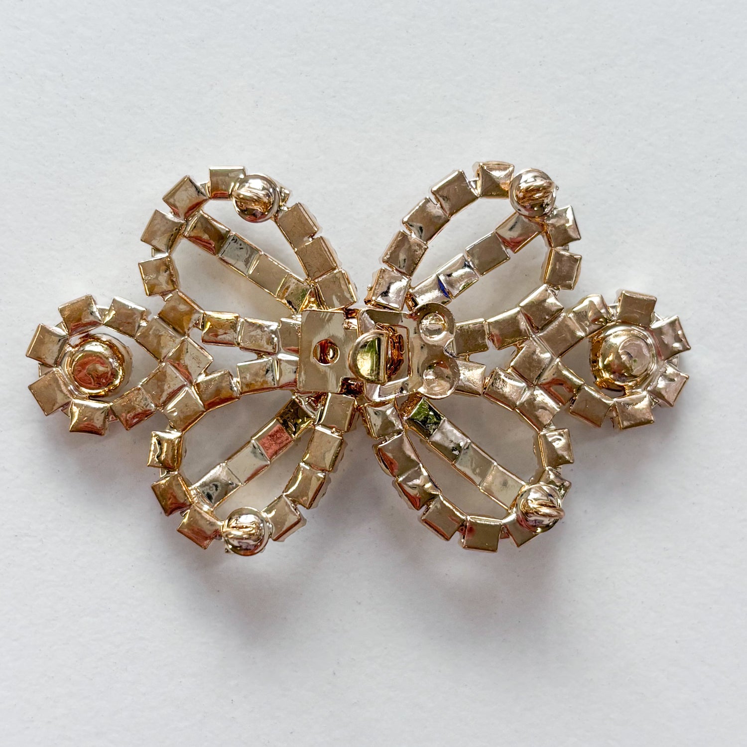 A gorgeous statement piece, this diamond bow in gold with clasp comes in 2 parts, similar to a frog but with the hook/bar concealed on the back. Button is secured to garment by 2 small shanks on each piece.