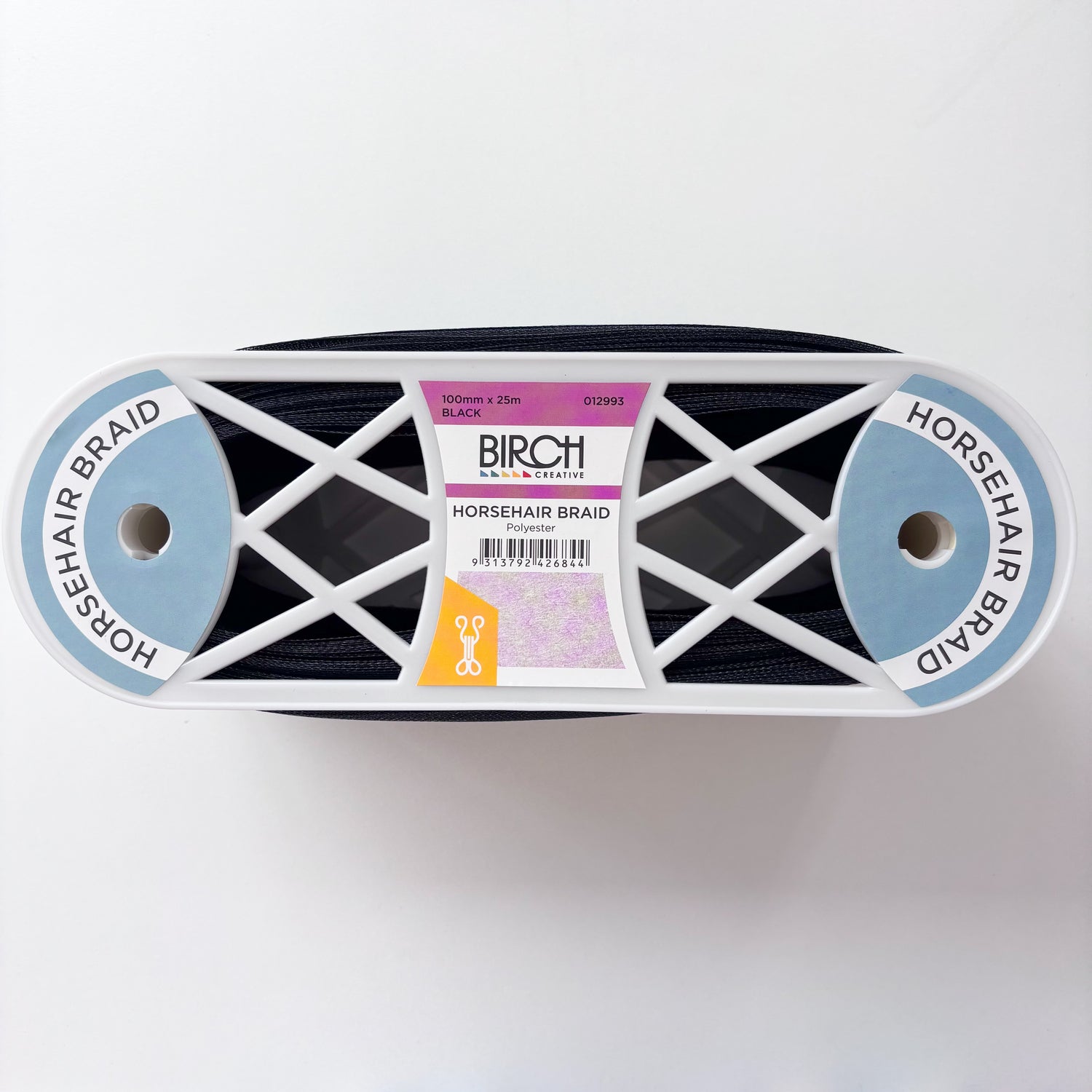 Horsehair braid is a crinoline netting made from polyester. It has many uses but most commonly used to hem dresses and skirts. It stabilises the hem giving it fullness and structure.